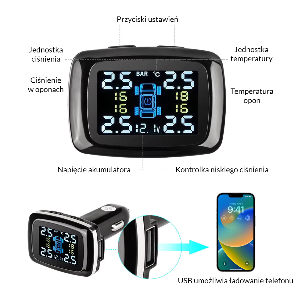 Nie musisz się domyślać. Ekran SENTINEL PRO™ wyświetla wszystkie kluczowe dane naraz: ciśnienie i temperaturę każdej opony, a nawet napięcie akumulatora. Co więcej? Port USB umożliwi ładowanie telefonu, dzięki czemu nie tracisz cennego gniazda.